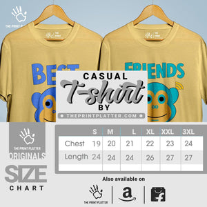Join the trendsetters with our Best Friends Cotton Bio Wash T-shirt! Made of 100% cotton, it's comfy and long-lasting. With a classic fit and quirky graphics, this crew neck tee is perfect for any occasion. Proudly crafted in India, it's a must-have for your wardrobe. Check out THE PRINT PLATTER for more cool t-shirts!