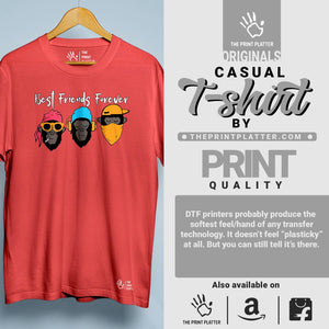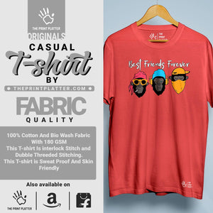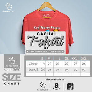 Get ready to make a statement with our Best Friends Forever T-shirt! Made from high-quality cotton, this durable and comfortable classic fit tee is perfect for any occasion. Featuring a crew neckline and half sleeves, it's the ultimate addition to your wardrobe. Proudly made in India with unique printed graphics from our brand THE PRINT PLATTER.