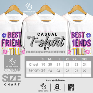 Introducing our quirky Best Friends Till The End Cotton Bio Wash 180gsm T-shirt! Made with high-quality 100% cotton, this durable classic fit tee has a crew neckline and half sleeves for a comfortable and stylish look. Proudly made in India, this must-have tee from THE PRINT PLATTER features unique printed graphics. Stand out from the crowd and upgrade your wardrobe now!