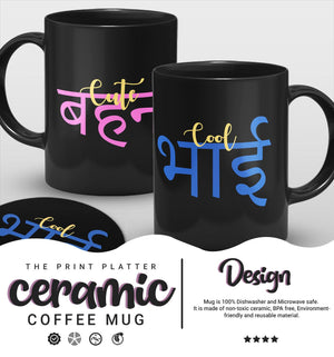 Cute Behen & Cool Bhai Raksha Bandhan Full Black Cermic Coffee Mug With Tea Coster 330 ml, Microwave & Dishwasher Safe Pack Of 2 | TM-21