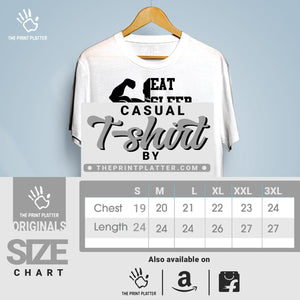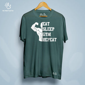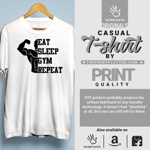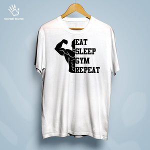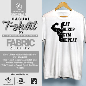 Elevate your style game with our Eat Sleep Gym Repeat T-shirt from THE PRINT PLATTER! Made from premium 100% cotton, this durable tee features a classic fit, crew neckline, and playful printed graphics - perfect for any occasion. Proudly crafted in India, this must-have addition will have you turning heads.