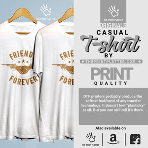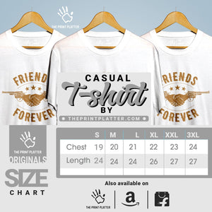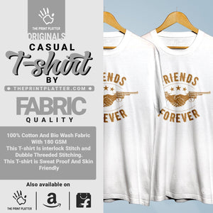 Get ready to make a statement with our Friends Forever Cotton Bio Wash 180gsm T-shirt! This high-quality, 100% cotton tee is both comfy and long-lasting. With a classic fit, crew neckline, and half sleeves, it's perfect for any occasion. Proudly made in India, this tee features fun and trendy graphics. From parties to everyday wear, this t-shirt from THE PRINT PLATTER will be your new fave!