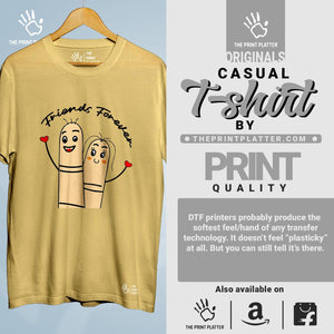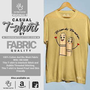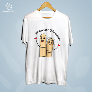 Elevate your style game with our Friends Forever T-shirt! Made from 100% cotton, this durable and comfy tee is perfect for all occasions. With a crew neckline and half sleeves, it's a wardrobe must-have. Designed with quirky printed graphics, it'll definitely catch some attention. Proudly crafted in India, exclusively from THE PRINT PLATTER.