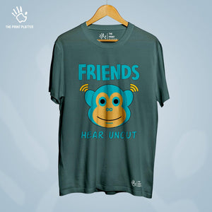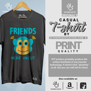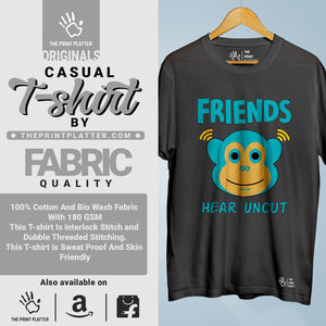 Upgrade your wardrobe with our Friends Hear Uncut Cotton Bio Wash 180gsm T-shirt! Made from high-quality 100% cotton, this classic fit t-shirt offers ultimate comfort and durability. With a crew neckline and half sleeves, it's perfect for any occasion. Proudly crafted in India, it features unique printed graphics for a trendy and fun look. Get yours now from THE PRINT PLATTER!