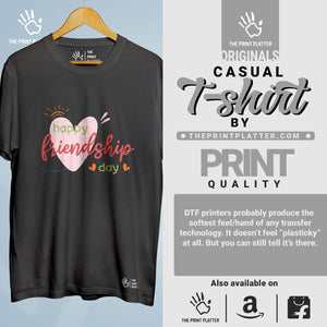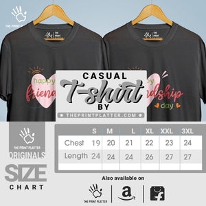 Celebrate Friendship Day in style with our Happy Friendship Day Cotton Bio Wash 180gsm T-shirt! Made from 100% high-quality cotton, it's ultra-comfy and built to last. Featuring a crew neckline and half sleeves, this classic fit t-shirt is perfect for any occasion. Proudly crafted in India, it's a must-have addition to your wardrobe. With unique printed graphics, it's time to showcase your inner trendsetter! From casual wear to parties, this t-shirt from THE PRINT PLATTER has got you covered. (Pun intended)