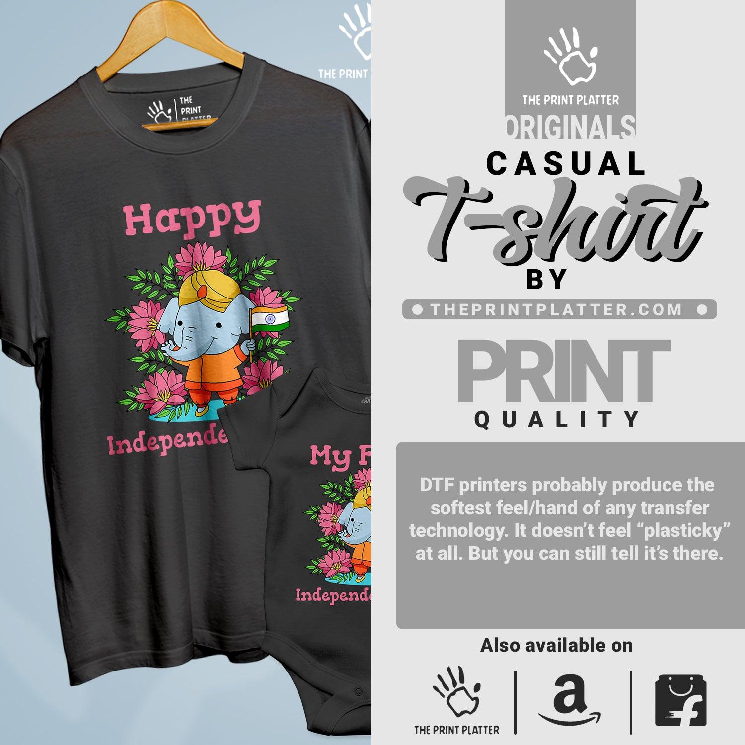 Celebrate Independence Day in style with our Happy Independence Day T-shirt and Romper Combo! Made from premium 100% cotton, this classic fit t-shirt features a crew neckline and half sleeves for ultimate comfort. With unique printed graphics and proudly made in India, it's a must-have addition for any stylish wardrobe. Get yours now from THE PRINT PLATTER!