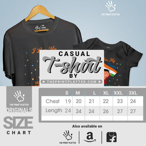 Celebrate Independence Day in style with our Cotton Bio Wash 180gsm T-shirt + Half Sleeve Romper Combo! Made with high-quality 100% cotton, this classic fit t-shirt offers both comfort and durability. Featuring a crew neckline and half sleeves, it's perfect for any occasion. Proudly crafted and made in India, it's a must-have addition to your wardrobe. Get ready to turn heads with our unique printed graphics. Available from THE PRINT PLATTER - check us out for more stylish and quirky t-shirts!
