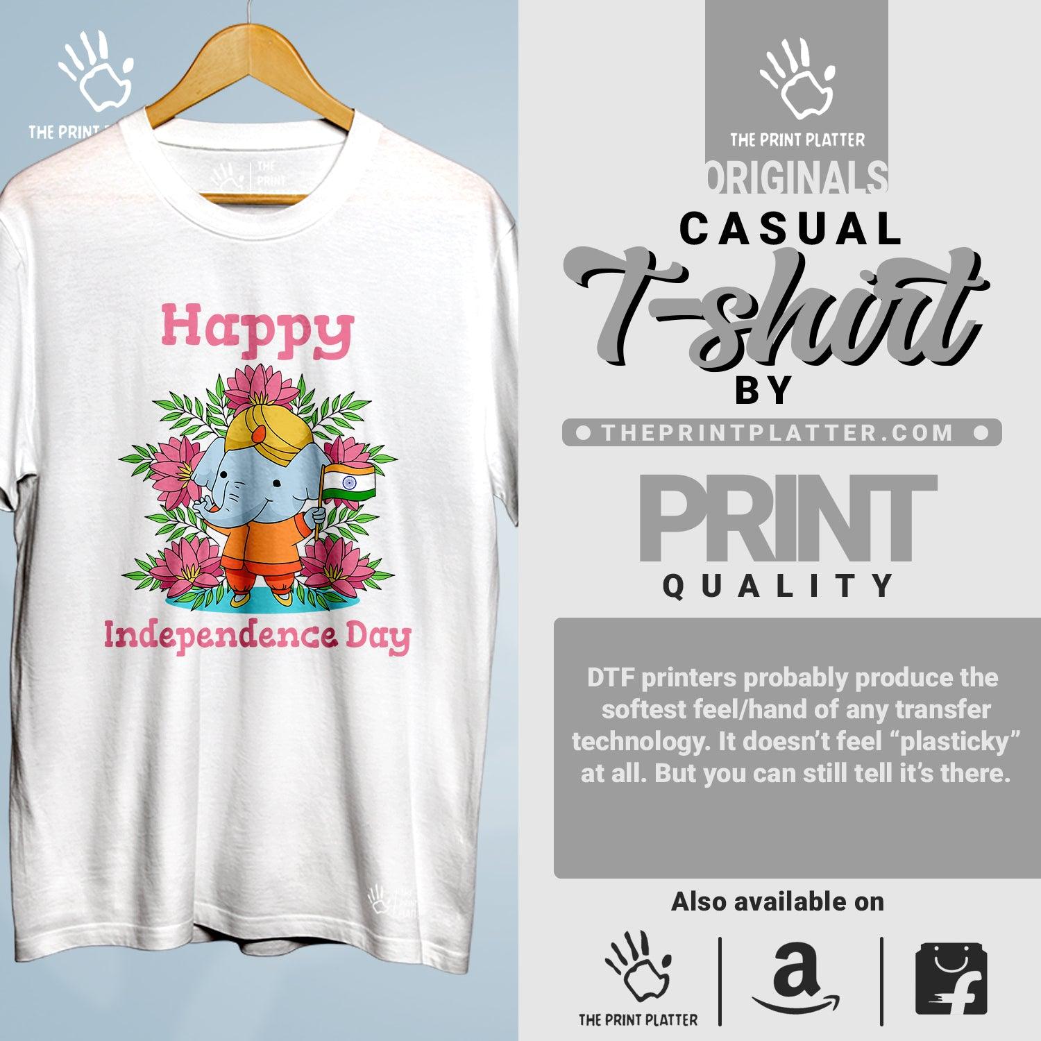 Get ready to celebrate in style with our Happy Independence Day Cotton Bio Wash 180gsm T-shirt! Made from high-quality 100% cotton, this classic fit tee is both comfortable and durable. Perfect for any occasion, from casual wear to parties. Proudly crafted and made in India, this must-have t-shirt features unique printed graphics from our brand THE PRINT PLATTER. Add some quirk to your wardrobe and turn heads with this standout piece!