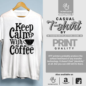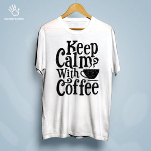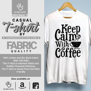 Say goodbye to boring t-shirts and hello to our Keep Calm With Coffee Cotton Bio Wash 180gsm T-shirt! Crafted from 100% cotton, this durable and comfy tee is perfect for any occasion. With a trendy crew neckline and unique printed graphics, you're sure to make a statement. Made in India, proudly brought to you by THE PRINT PLATTER.