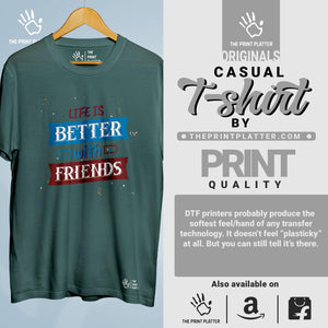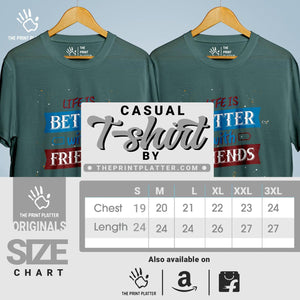 Be a trendsetter with our Life Is Better With Friends T-shirt! Made from high-quality 100% cotton, this classic fit tee is both comfy and long-lasting. Featuring a crew neck and half sleeves, it's suitable for any occasion. Proudly designed and made in India. Available now from THE PRINT PLATTER!