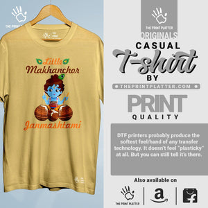 Be the life of the party with our Little Makhanchor Krishna Janmashtami T-shirt! Made from 100% cotton, it's soft, durable, and perfect for any occasion. Proudly made in India, this classic fit tee features a crew neckline and half sleeves. Stand out with our quirky graphics from THE PRINT PLATTER. Grab one now and show off your style!
