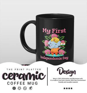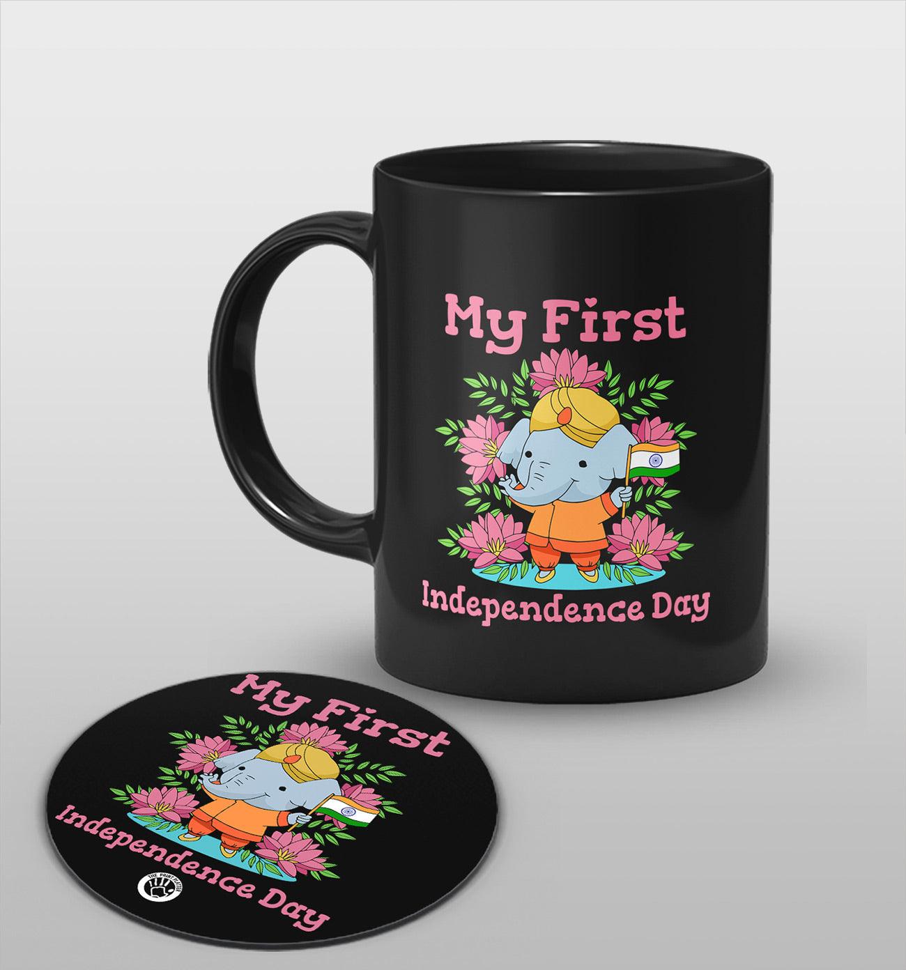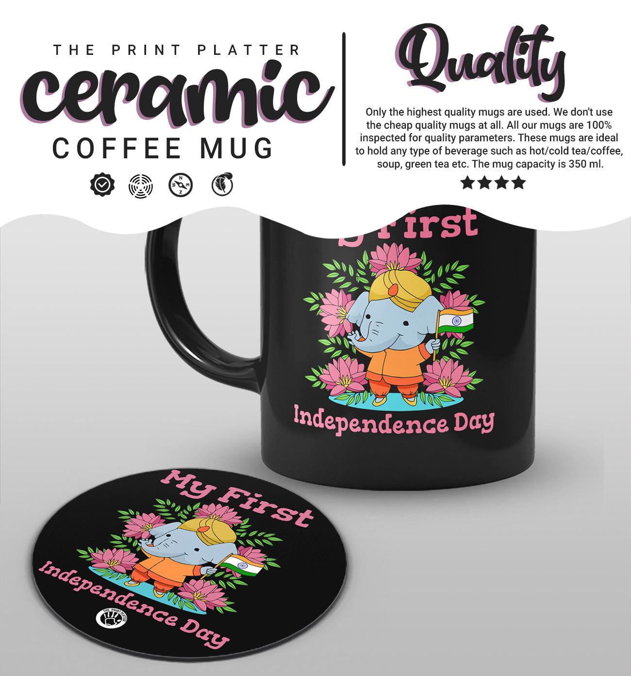 My First Indipendence Day Full Black cermic Coffee Mug With Tea Coster 330 ml, Microwave & Dishwasher Safe| TM-01