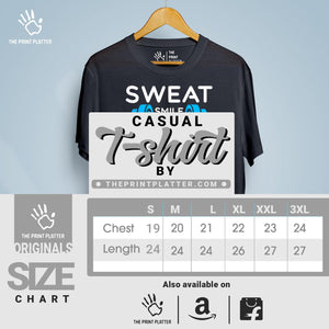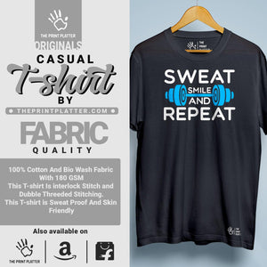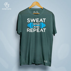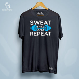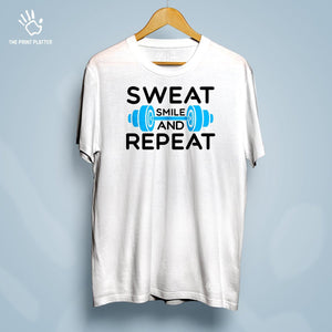 Get ready to stand out with our Sweat Smile And Repeat Cotton Bio Wash 180gsm T-shirt! Made from high-quality 100% cotton, this durable and comfortable t-shirt features a classic fit, crew neckline, and half sleeves - perfect for any occasion. Proudly crafted and made in India, its unique printed graphics will make you the envy of any trendsetter. From casual wear to parties, this t-shirt from THE PRINT PLATTER is a must-have addition to your wardrobe.