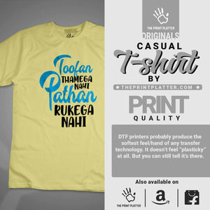 Get ready to steal the show with our ToofanPathan Cotton Bio Wash 180gsm T-shirt! Made from 100% high-quality cotton, this durable, classic fit t-shirt is perfect for both casual wear and parties. Proudly crafted in India, it features a crew neckline, half sleeves, and unique printed graphics that will make you stand out. Add a touch of quirk to your wardrobe with this must-have from THE PRINT PLATTER!