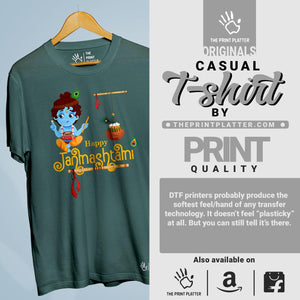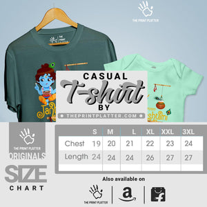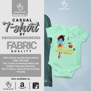 Get ready to make a statement with our Happy Janmashtami Unisex Cotton Bio Wash 180gsm T-shirt + Half Sleeve Romper Combo! Made from high-quality 100% cotton, this tee is not only comfy but also long-lasting. With a cool crew neckline and half sleeves, it's perfect for all occasions. Proudly crafted in India, channel your inner trendsetter with our unique printed graphics. From casual to party wear, this must-have addition to your wardrobe is available now from THE PRINT PLATTER. Don't miss out on our stylish and quirky collection!